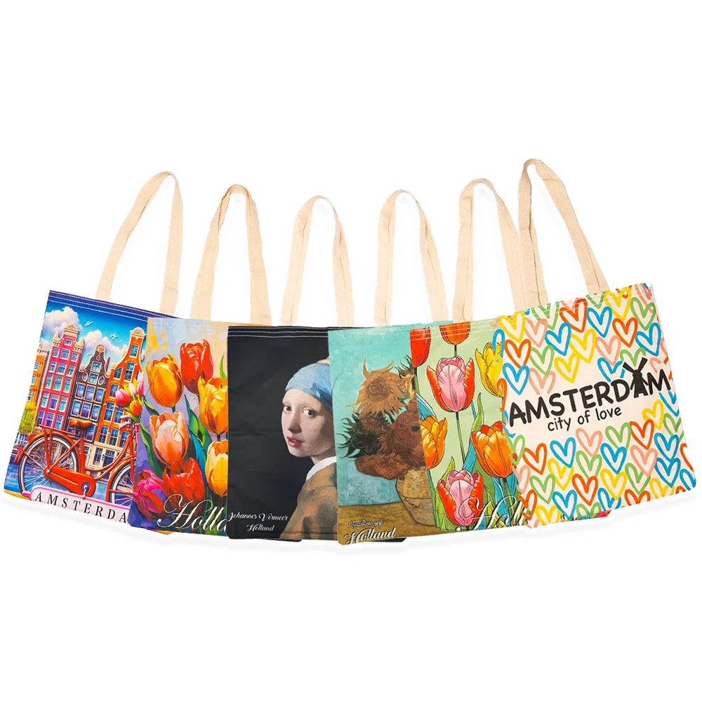 Steeds vaker worden eigen tassen meegenomen tijdens het winkelen. Een populaire tas die hiervoor gebruikt wordt is de canvas tas. Bij Klompjes.com hebben wij een breed assortiment aan canvas tassen voor u. Al deze canvas tassen zijn te bestellen met verschillende Hollandse thema’s en kleuren. Zo kunt u kiezen uit canvas tassen met Hollandse opdrukken zoals het kussend paartje, molens en tulpen. Ook hebben wij meerdere Amsterdamse canvas tassen. Denk aan fietsen en grachtenpanden. Ook hebben wij Achterhoekse vlag tassen voor iedere trotse Achterhoeker. U kunt kiezen uit tassen van 40 bij 40 centimeter of 45 bij 45 centimeter.
