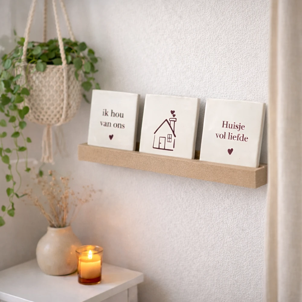 Deze sfeervolle set van drie keramieken tegeltjes in het thema Huis staat symbool voor samen wonen, thuiskomen en verbondenheid. De teksten “ik hou van ons” en “Huisje vol liefde”, samen met het minimalistische huisje, maken deze set perfect voor stellen die samen een woning delen of net een nieuw thuis hebben betrokken. De zachte beige kleur en de subtiele bordeauxrode opdruk geven de tegeltjes een rustige, warme uitstraling die in vrijwel ieder interieur past.