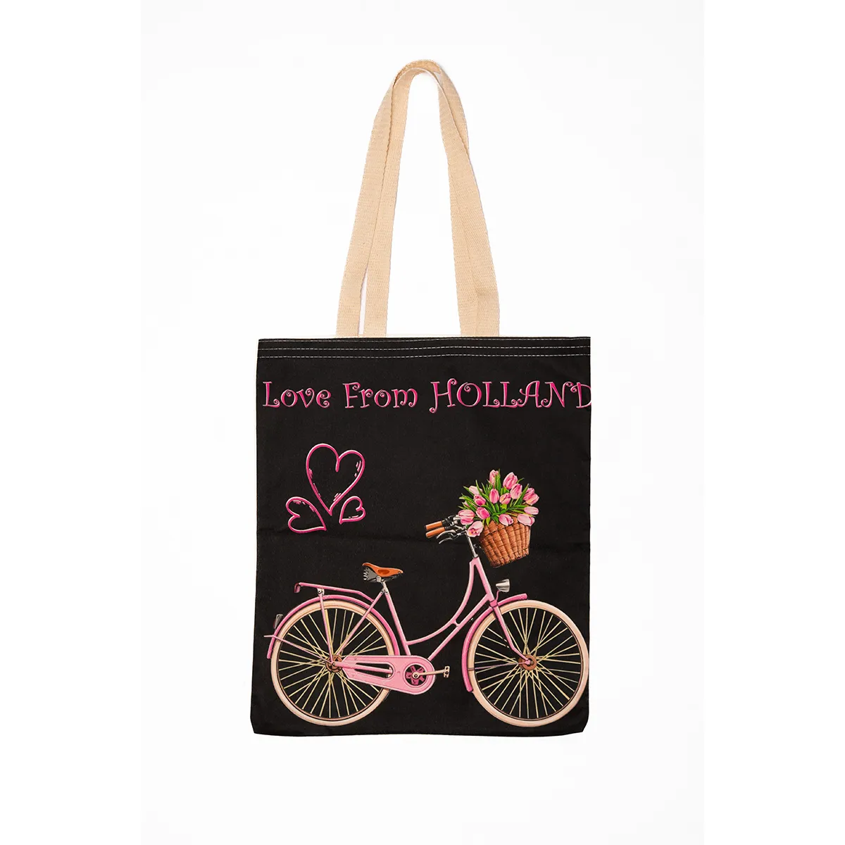 Het design op zwarte achtergrond bestaat uit de tekst Love from Holland, drie kleurrijke hartjes en een roze fiets met mandje. Dankzij het ruime formaat van 40x40 cm en een draagkracht van 20 kg is de tas niet alleen een blikvanger, maar ook super praktisch. Gemaakt van 100% katoen (140 g/m²), duurzaam, lichtgewicht en herbruikbaar – ideaal voor boodschappen, school, werk of als trendy shopper. Een perfect souvenir of cadeau voor Holland-liefhebbers!