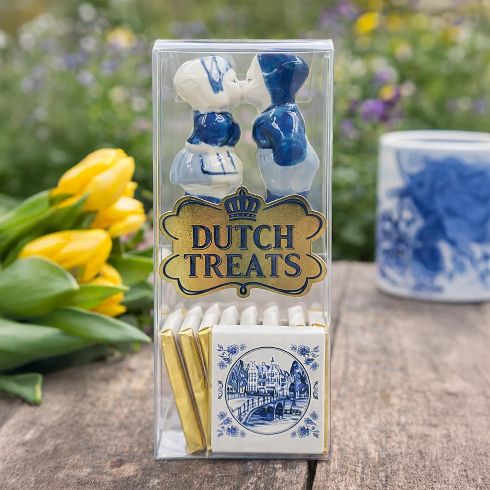 Op zoek naar een typisch Nederlands cadeau? Deze unieke Holland geschenkverpakking met kussend paar en chocolade combineert twee iconische Nederlandse symbolen in één stijlvol pakket. Perfect als souvenir, relatiegeschenk of cadeautje. De set bevat een porseleinen kussend paar (6 cm) met een prachtig Delfts blauw molenmotief, verbonden door een lint in de kleuren van de Nederlandse vlag. Dit geeft het geheel een authentieke en traditionele Hollandse uitstraling. Daarnaast bevat de verpakking 10 individueel verpakte chocoladetabletjes, ideaal om te delen of zelf van te genieten. Dankzij het compacte formaat is dit cadeau eenvoudig mee te nemen of te versturen.