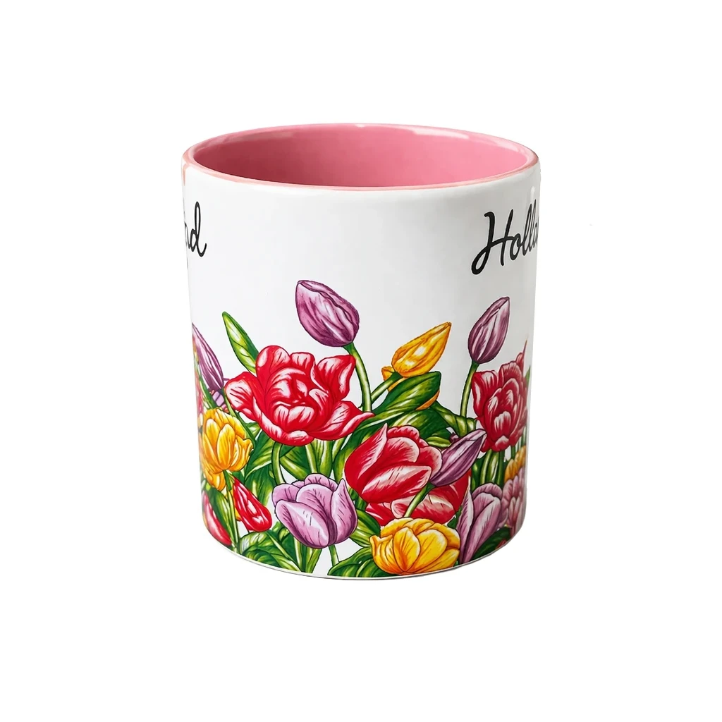 Stevige keramieken mok in groot formaat, versierd met verschillende kleuren tulpen.