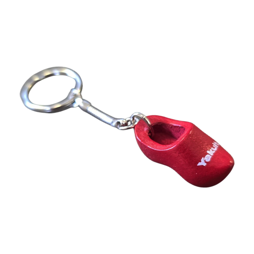 Rode sleutelhanger klompjes van 4cm met het logo van uw bedrijf of vereniging.