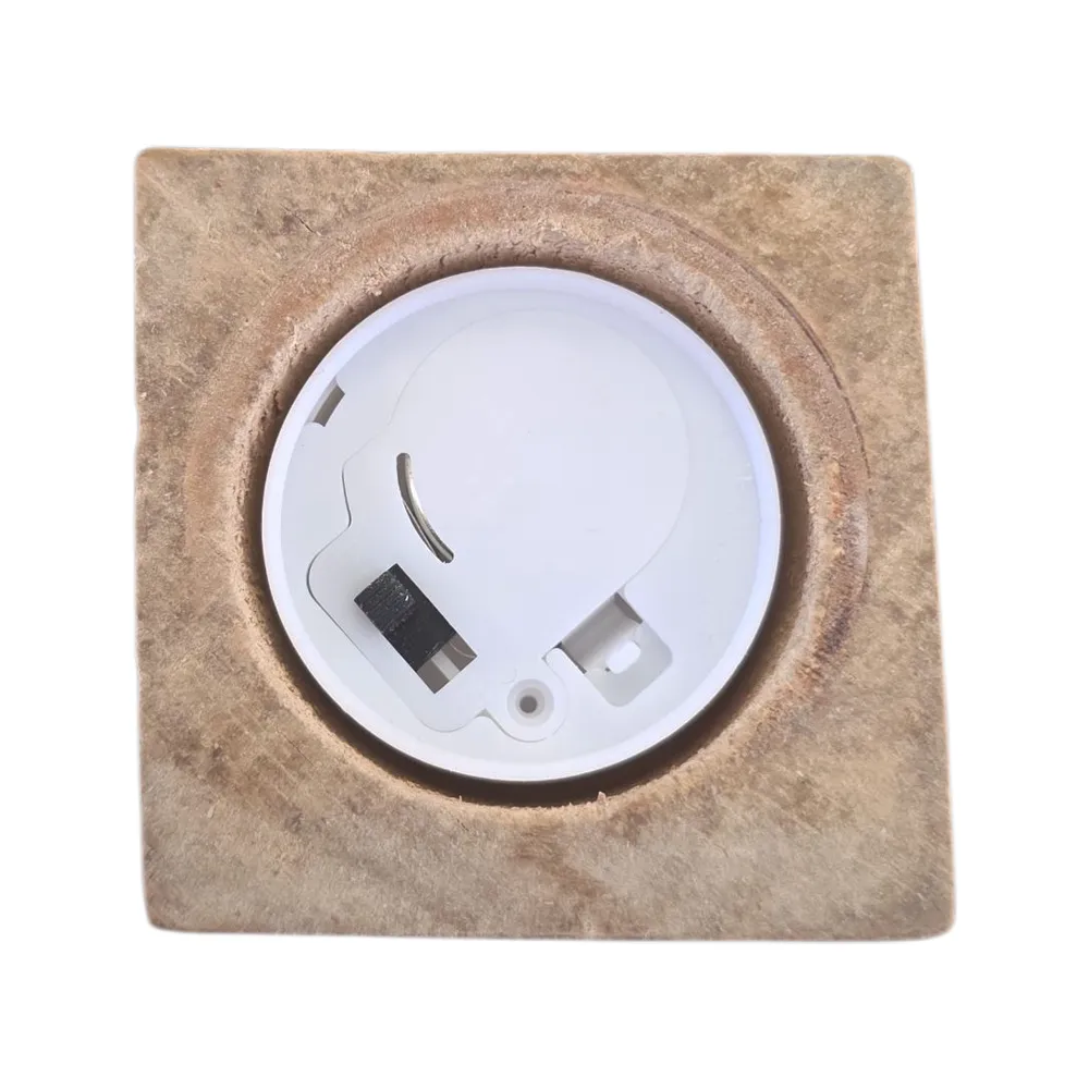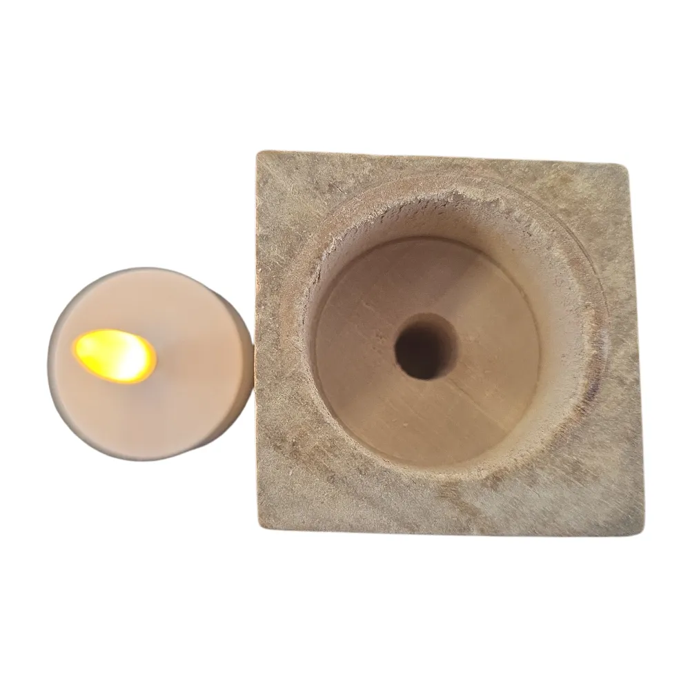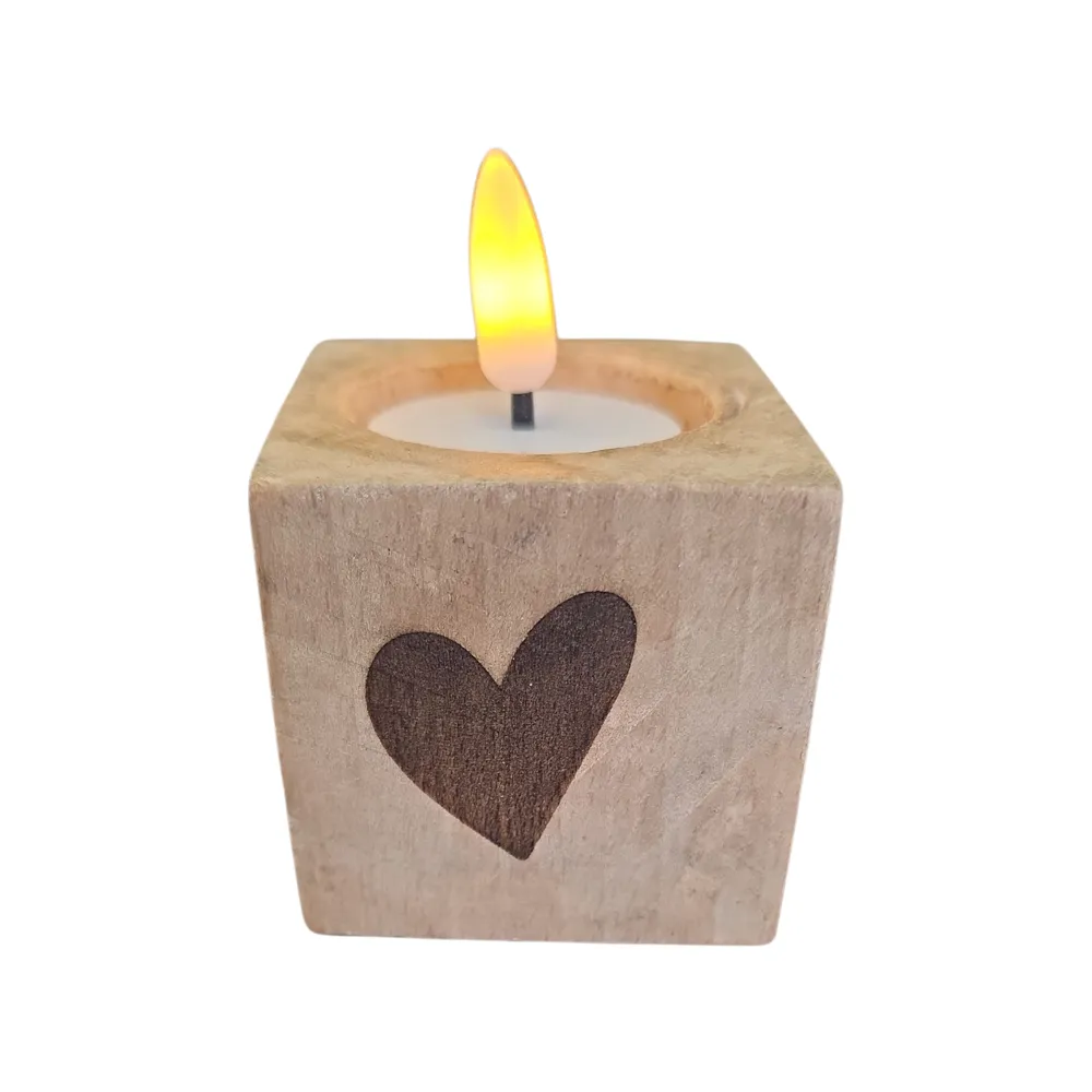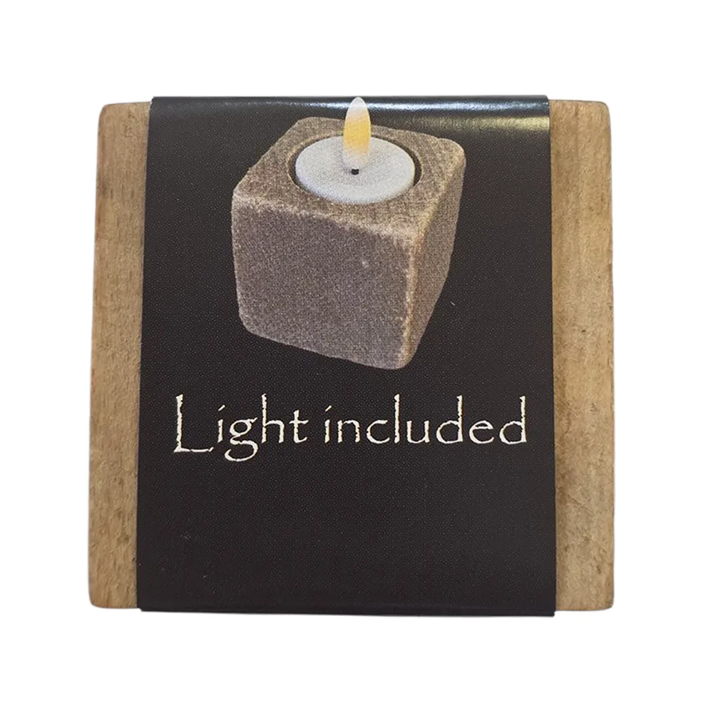 De houder wordt geleverd met een waxinelichtje op batterij, zodat je veilig en zonder zorgen een warm lichtje kunt laten branden. Het houten blokje is zo ontworpen dat het waxinelichtje erin kan worden opgeborgen.